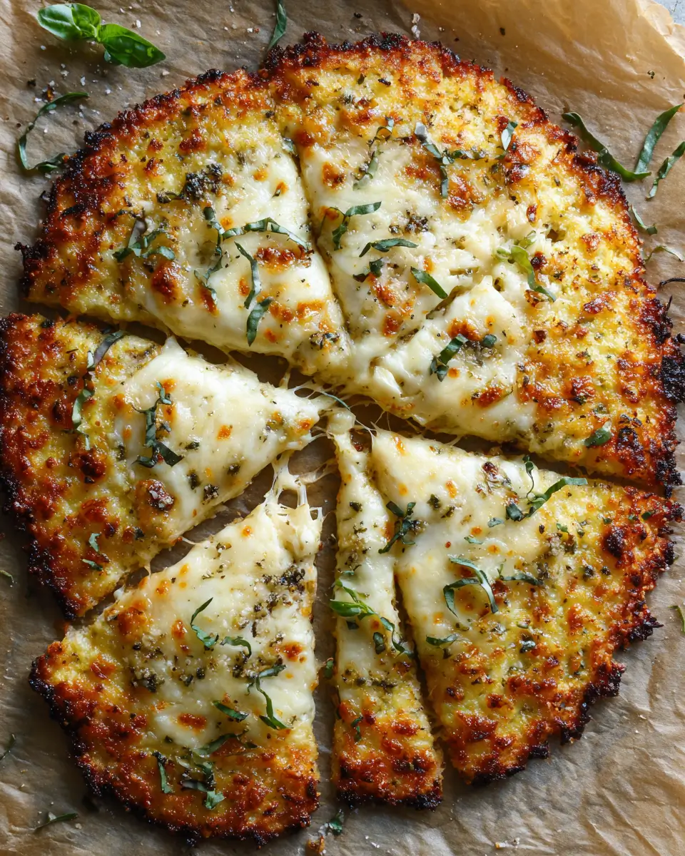 Crispy cauliflower pizza crust sliced on parchment with golden edges and melted mozzarella , cauliflower pizza crust