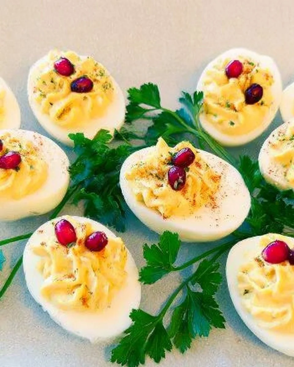 2. Garnish each deviled egg with a parsley stem and sprinkle with 2-3 pomegranate seeds.