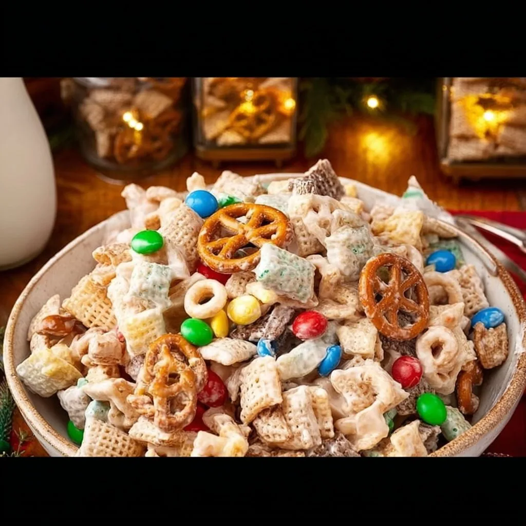 A delightful and festive mix of cereals, pretzels, and M&Ms coated in sweet vanilla almond bark, perfect for holiday gatherings.