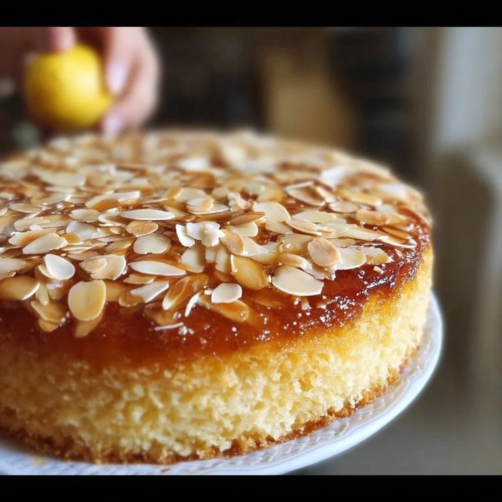 3. Caramelize the sliced almonds in a pan with honey, then pour over the filled cake.
