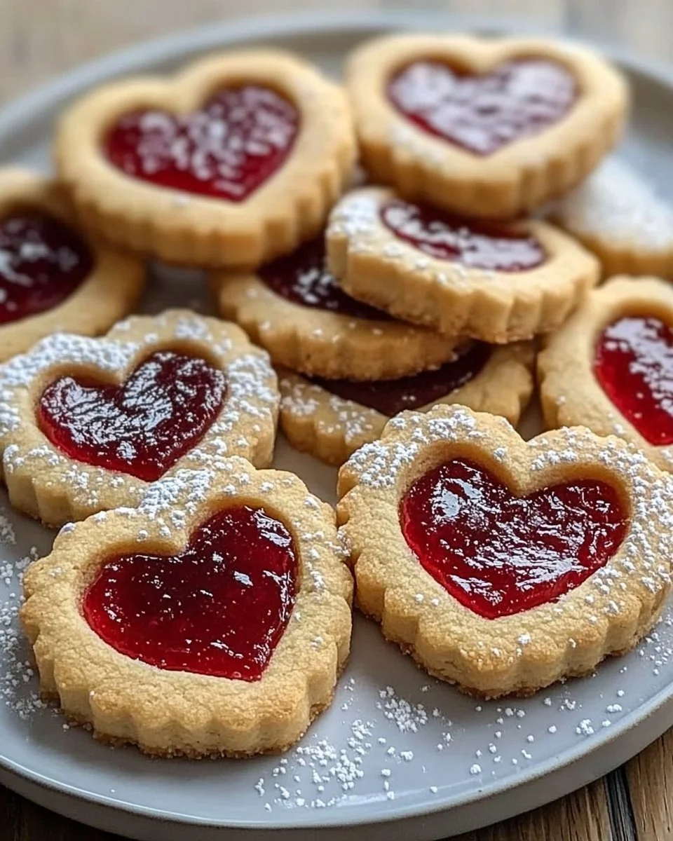 These cookies are at their best when shared slowly, in small circles. We place them on a low plate and pass it around after a quick game or when friends stop by. The jam gleams like a tiny sun in each heart, and that sight is enough to make little conversations bloom.