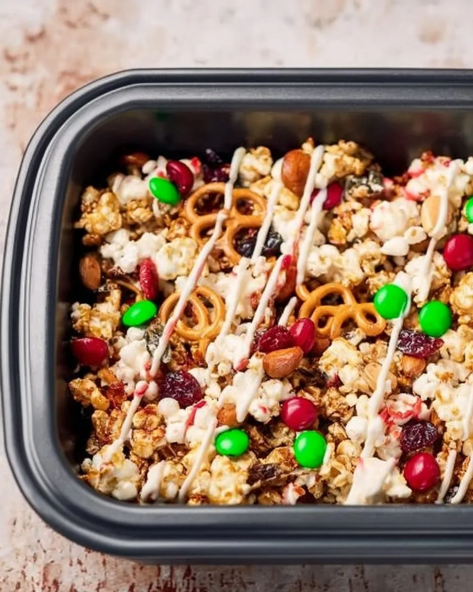 A festive and easy treat that combines nuts, chocolate, and cereal for a delightful crunchy snack reminiscent of holiday gatherings.