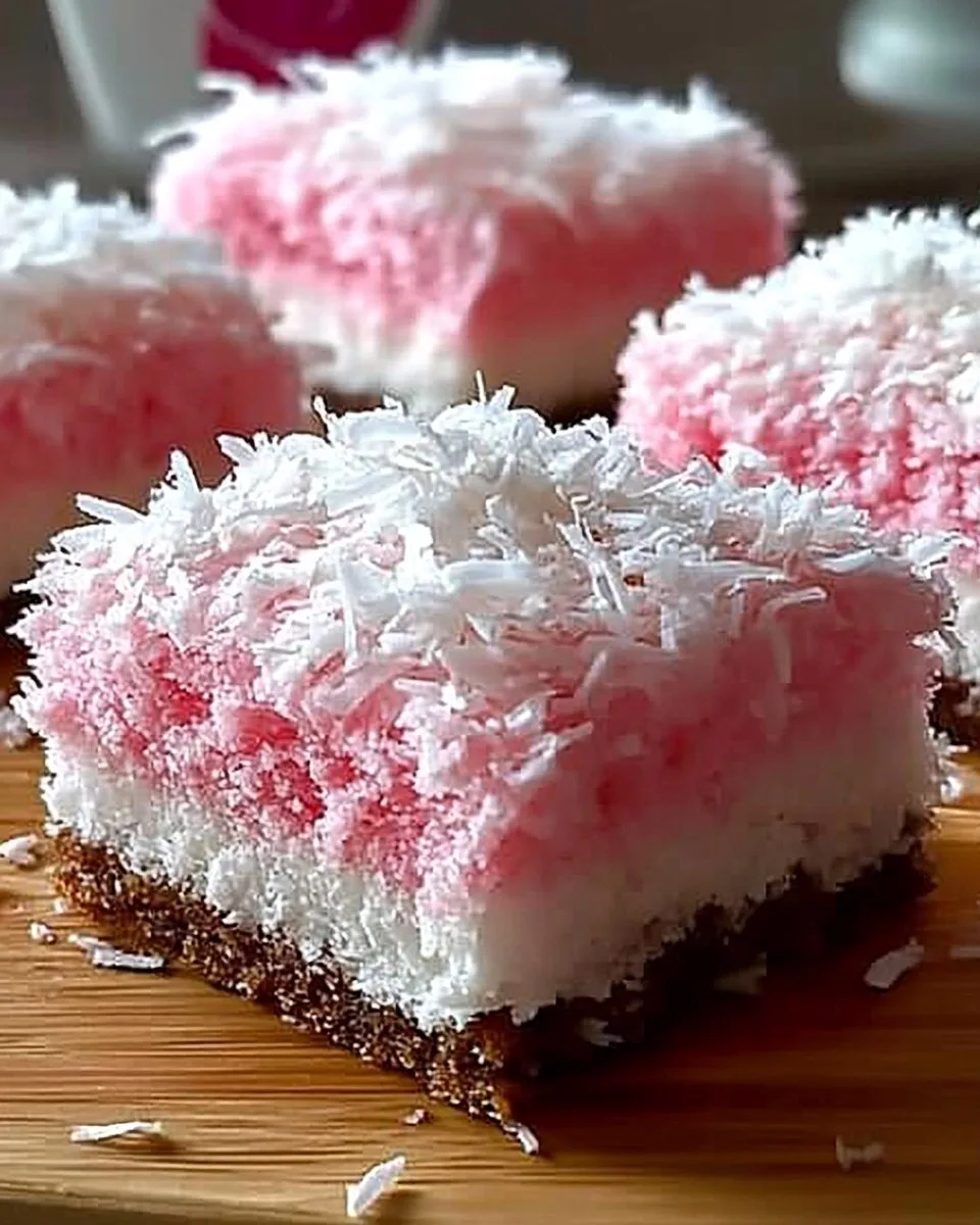 If someone in the house is allergic to coconut I sometimes swap the topping for a simple powdered sugar glaze with pink coloring and sprinkle finely chopped nuts on top if that is allowed. For a lower sugar version I reduce the powdered sugar in the topping by a third and serve smaller squares. On busy mornings I cut the bars small and wrap them individually so the lunchbox hits the table faster and the kids can grab one without asking.