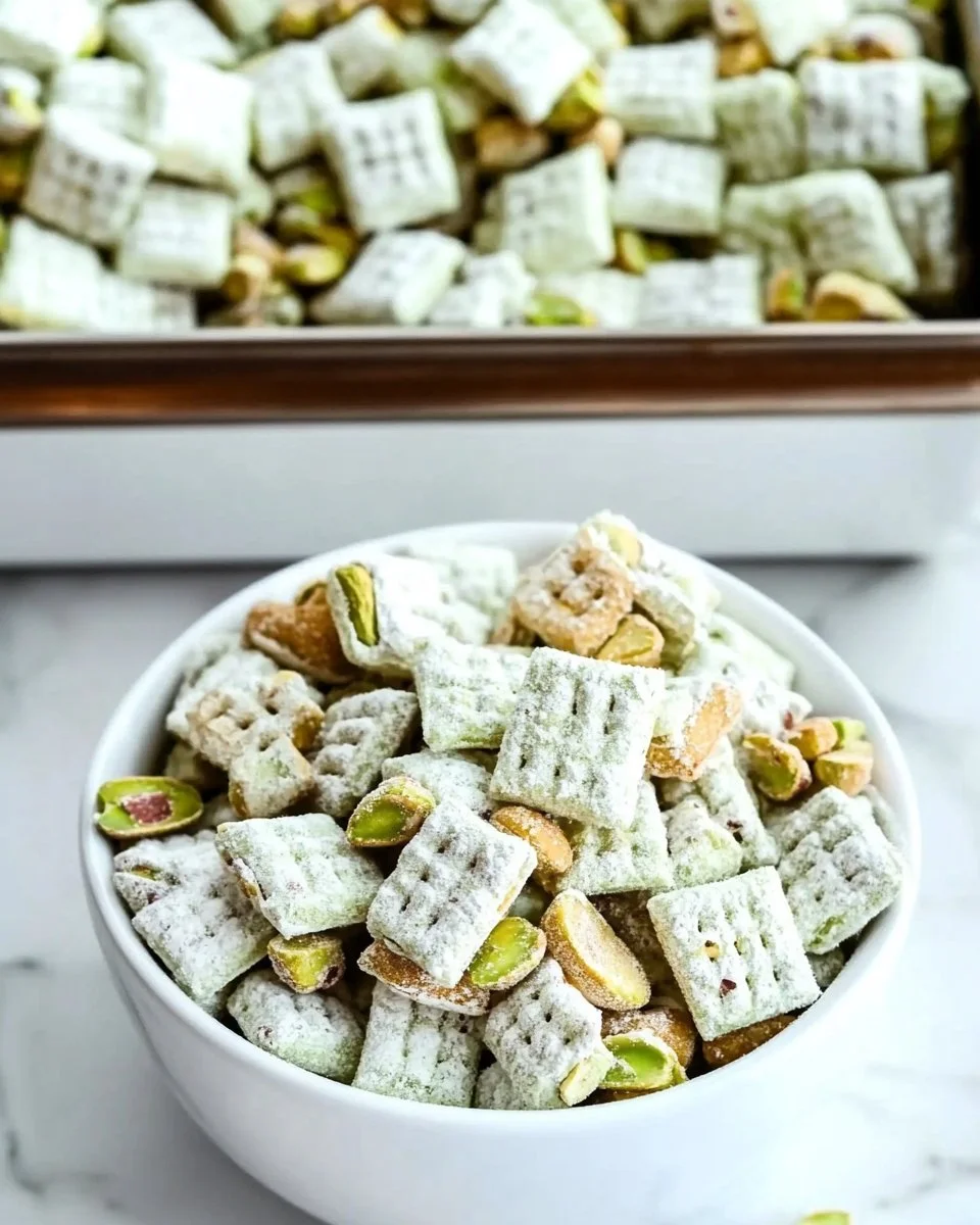 I can smell it before I even open the pantry door. The warm white chocolate softens in the microwave and the house gets this gentle, sweet cloud of pistachio from the pudding mix, and my youngest comes running because she knows there will be a crunchy bowl to graze on while we finish homework. It is a small noisy moment that feels like the whole evening wrapped into one snack. I made this Pistachio Puppy Chow on a week when the car needed a new tire and the school had a bake sale at the same time, and somehow the bowl of green-speckled sweetness kept us smiling through it.