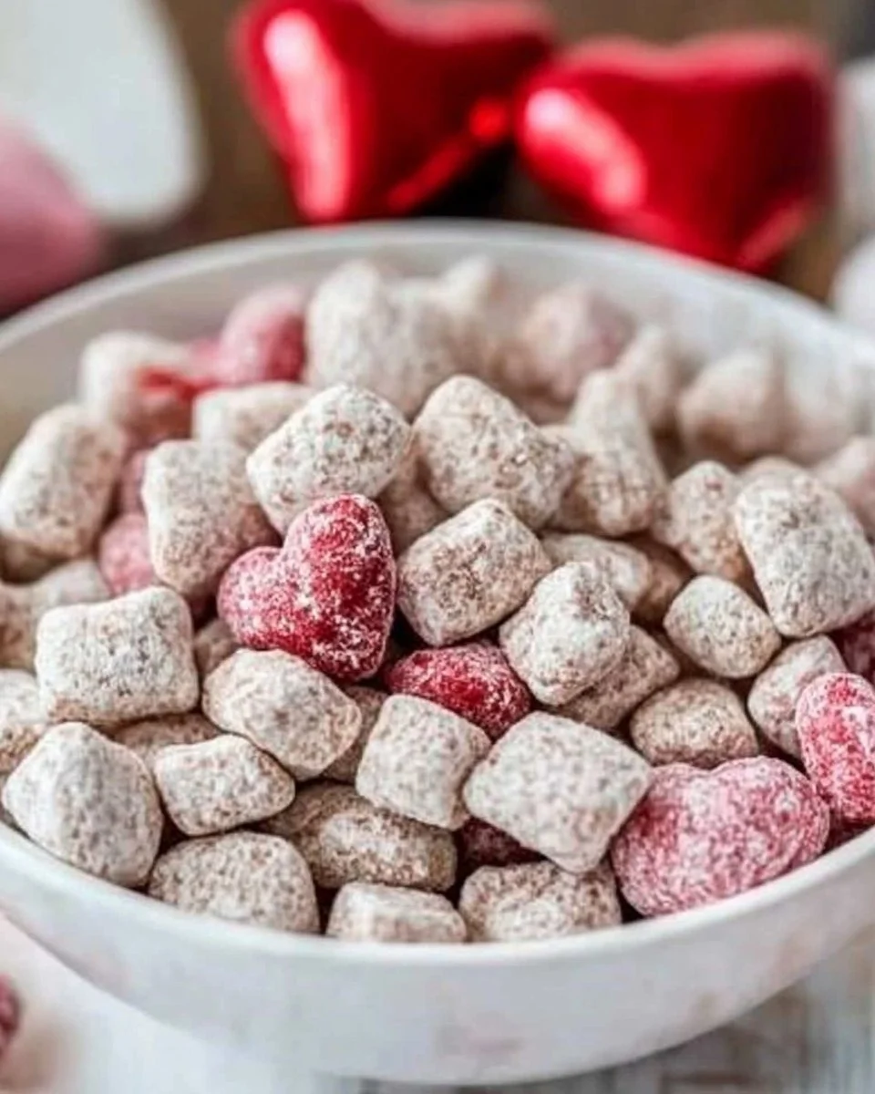 I hope this Valentine’s Day Muddy Buddies makes your evening a little easier and your kitchen feel a little warmer. These are the little things that help us through the week, the tiny rituals that give a pause between the errands and the school runs. If you make a batch, give one to a neighbor or tuck a handful into a lunchbox and watch a small moment brighten someone’s day.