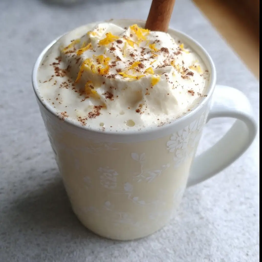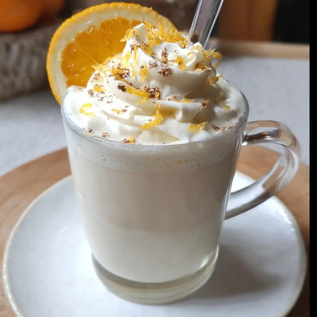 A comforting drink combining sweet white chocolate and zesty orange, perfect for cozy family gatherings.